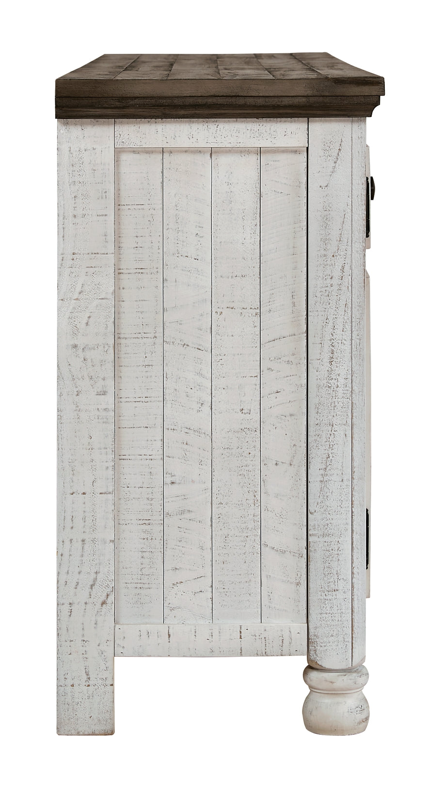 Have your fill of modern farmhouse style with this TV stand. Its distressed two-tone finish pairs a vintage white with a weathered gray for a look that’s utterly charming. Right and left cabinets open to reveal adjustable shelving for all your entertainment center storage needs. Center glass doors add to its relaxed appeal.