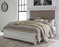 Give your retreat vintage charm with this queen upholstered panel bed. In a beautifully distressed whitewash finish, you'll love the headboard's grand style featuring an inset button tufted upholstery cushion. Generously scaled moulding from top to bottom, along with bun feet and nailhead trim give this bed character—evoking the feel of a quaint cottage escape.