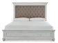 | Details | Includes queen upholstered headboard, panel footboard and rails, Made with solid wood, veneers and engineered wood, Distressed whitewash finish, Button tufted fabric upholstery, Nailhead trim, Foundation/box spring required, sold separately, Mattress available, sold separately, Assembly required | |